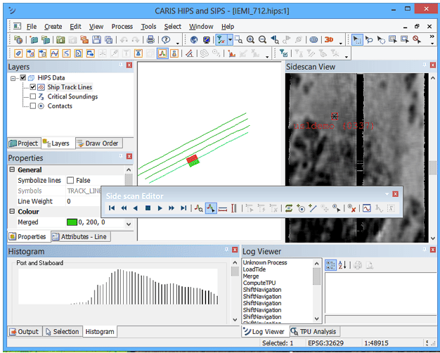 As well, a histogram of the sonar file is displayed in the Histogram window, and the Side Scan toolbar is activated.