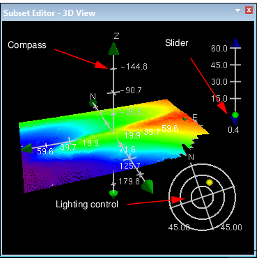 The compass (or control axes) rotates the view, the lighting control adjusts illumination, and the slider on the scale bar adjusts vertical exaggeration.