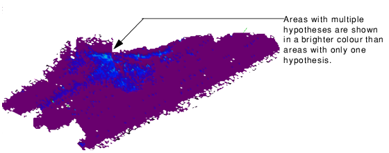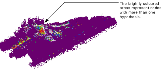 More than one hypothesis or a low confidence value does not necessarily mean an error. Uneven areas (slopes, for example) show more than one hypothesis because of the changing terrain. Nodes with multiple hypothesis should be examined in the Subset Editor. See Hypothesis Cleaning.