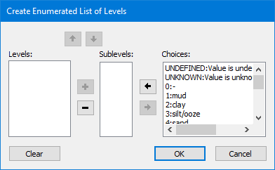 Enumerated attributes where the values can be ranked in order. Examples are the NATSUR and NATQUA attributes. Attribute values can be on an equal level or in a hierarchy. • Values on an equal level are separated by a comma. A surface that contains both mud (1) and shells (17) is shown as • Values in a hierarchy are separated by a slash. A surface that contains a top layer of mud (1) and sub-layer of stone (5) is shown as | 1. Select the attribute. 2. Click browse ( The Create Enumerated List of Levels dialog box is displayed.