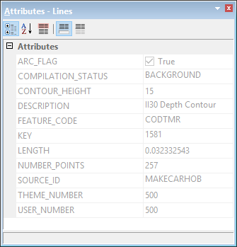 The Attributes window is used to view and edit attribute information for the superselected feature. By default, the values in this window are read-only. To edit the attribute values of a feature, Edit mode must be enabled by selecting the Edit Mode command. See Edit Mode for information on this command.