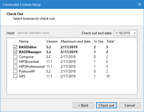 The Check Out step is displayed. This step is used to select the modules licenses you want to check out and the end date for the commuter license.