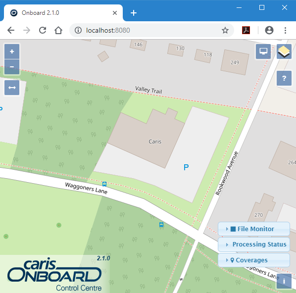 In Map View mode, the interface consists of a web map viewer and various tools. The web map viewer is used to view survey data as it is being processed via the Onboard service. This data can be in the form of a raster coverage or track lines.
