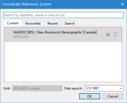 The search box is used to search for coordinate reference systems using a text string. Strings are found if they appear in the identifier, the reference system name, or the area of use.