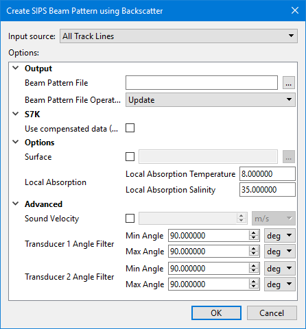 Input Source | The source of the data: • To create the beam pattern file from the selection, set the Source field to Selection. • To create the beam pattern file from all open lines, select the All Track Lines option in the Source field. |