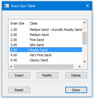 The classes of sediment which are displayed by the sediment analysis are based on values in the Grain Size table. This table can be customized while in Advanced mode.