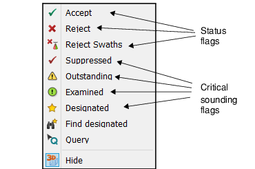 Status flags for selected soundings can be turned on from the right-click menu in the Subset Editor 2D or 3D View. Flags can also be set for queried soundings from the right-click menu in the Selection window.
