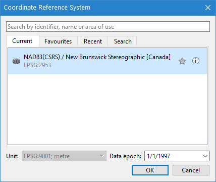 The search box is used to search for coordinate reference systems using a text string. Strings are found if they appear in the identifier, the reference system name, or the area of use.