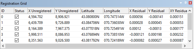 Residual values reveal discrepancies in the control points and help identify points that are off-position. Residuals are shown as decimal degrees regardless of the settings in Options.