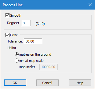 When the command is run, the vertices in the selected features are analyzed to determine whether the edges need to be smoothed, filtered or both. If either operation is performed, the change(s) are reported in the Output window.