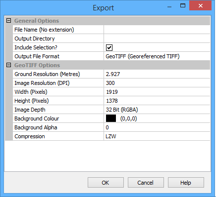 For all image formats except KMZ, resolution is determined by four related options: Ground Resolution, Image Resolution, Width, and Height. Adjusting any of these adjusts all the others.