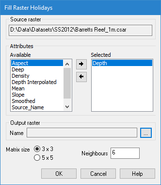 Neighbours | The number of pixels within the matrix area that must contain data in order for the hole to be interpolated. For example, if you select the 3x3 matrix size option and enter a neighbours value of 6, that area must have at least 6 populated data nodes in order for a pixel in the hole to be interpolated. If there are not enough populated nodes present in the matrix area, it is possible that only some pixels in the hole will be interpolated or the hole will be skipped entirely by the process. |