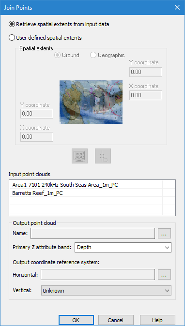 4. Select a method for defining the spatial extents, either manually or automatically using the extents of the input point clouds.