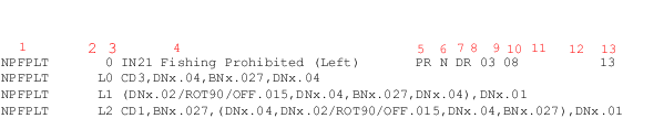 The field numbers are on the first line and the field names on the second line. The main record is on the third line; subrecords describing how the line is patterned are on subsequent lines.
