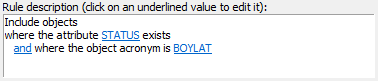 Certain terms in the conditions are hyperlinks. You use these links to define the specific acronym, feature type, or value that you want to match, or to change the conditional operator from “and” to “or”.