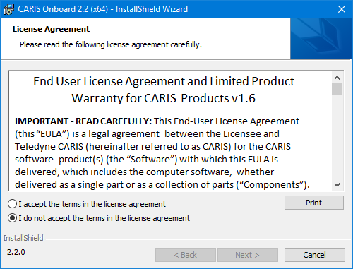 If the agreement is not accepted, the installation is cancelled and no further dialog boxes are displayed. If the agreement is accepted, the installation continues.