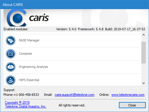The versions and build number of the installed application. This information is required when contacting Teledyne CARIS Customer Support.
