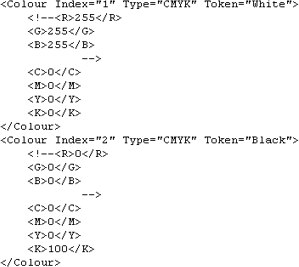 The ih_colour.xml file is a colour map that defines colours for features. Each colour is assigned an index number and colour token. Colours can be defined as: