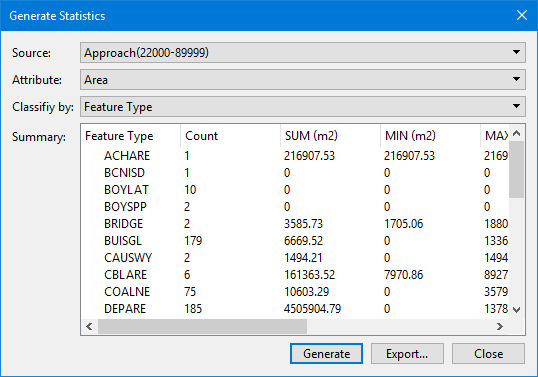 Generate | Generate statistics for the selected layer according to the specified settings and display them in the Summary field. A message will be displayed if the selected source layer does not contain any feature objects. |