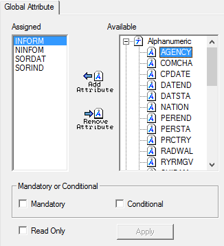 | Assign an attribute as a global attribute. 1. Expand the Available list. 2. Select an attribute. 3. Click Add Attribute. The attribute is moved to the Assigned list. |