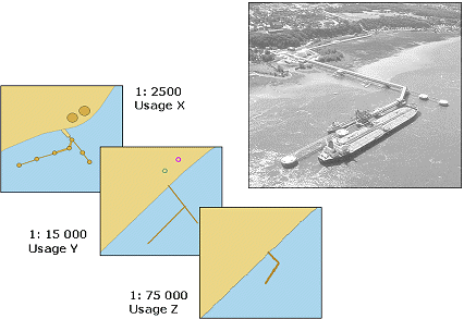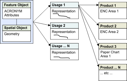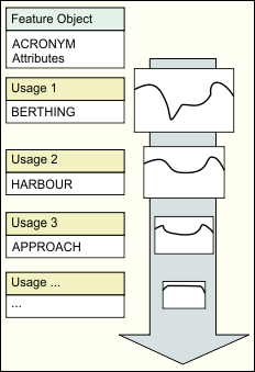 You can store multiple representations of an object in usages (for example, coastal, harbour, overview, approach), where each usage represents a particular scale range and provides a certain amount of detail depending on the scale.