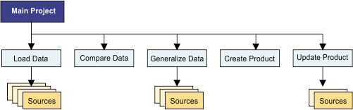 You can create separate projects for each lower-level task, some of which may have their own data sources (for example, projects relating to loading data). You can then add each of these projects to the overall project.