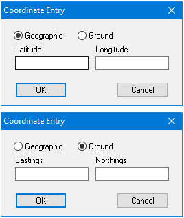 Coordinate values | These depend on the coordinate type: • Latitude and Longitude: These values include an indication of the direction from the equator or the prime meridian. If you do not enter an indicator, the coordinate value will be positive. Indicators can be: • Quadrant indicator: A character at the end of the coordinate value, which can be • Positive and negative indicator: A plus or minus sign at the start of the coordinate value. North and East are positive (+), West and South are negative (-). • Eastings and Northings: These can be positive or negative. They do not refer to north, south, east, and west. Type coordinates in the boxes. |