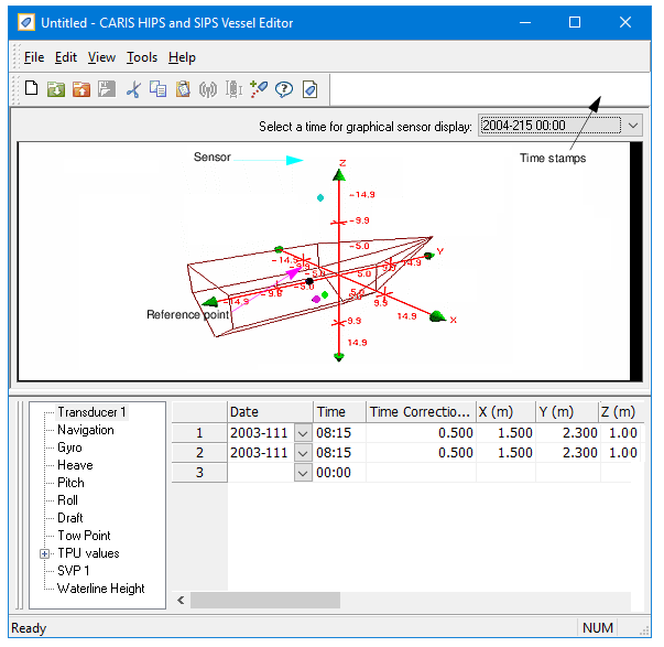 Use Vessel Editor to create HIPS vessel files, and to edit sensor offsets and uncertainty estimates in those files. Vessel Editor is launched from the HIPS and SIPS interface.