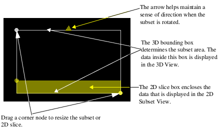 The amount of data viewed in Subset Editor is determined by the subset bounding box. As the bounding box area is changed, a new subset is generated and the displays in the 2D and 3D Views are refreshed to show the new area.