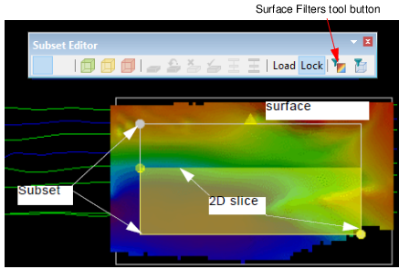 You can load a surface and apply filtering to the full subset or to the part of the surface within the subset 2D slice. See also Filter Processed Depths