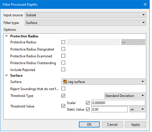 Options for surface filtering are set in the Filter Processed Depths dialog box.
