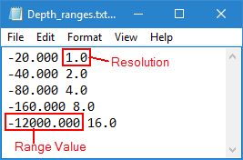 A sample range/resolution file, Depth_ranges.txt, can be found in the ProgramData directory and is pictured below.