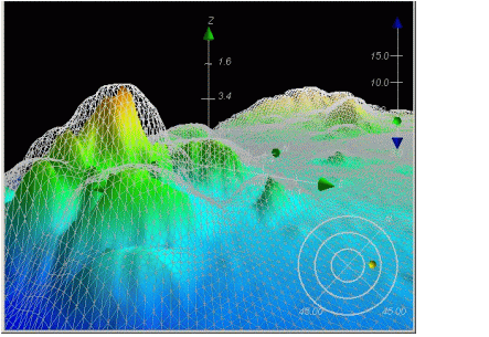 In the following image, the webbed surface overlaying a surface represents the generalized area after defocusing has taken place. The shoals are preserved, but without the sharply defined detail of the original surface.