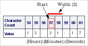 The same column number is referenced for each piece of data, but a start and width value have been specified for the characters of each piece of data within the column.