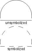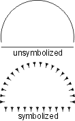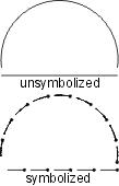 | The scalloped line uses the following line pattern definition: • TOL99.9 - used to eliminate all significant points • KSC - changes the symbol ID to SC • BNX.048 - leaves a blank • SYE - places the scallop symbol on the preceding blank; the symbol is sized so that it occupies the entire blank thus giving the appearance of a scallop. The symbol should be designed as shown. The repeat and short patterns are identical to the beginning pattern, except the symbol change command is not included. EXAMPLE19 0 Symbolization example 20 BK N DR 03 05 13 EXAMPLE19 L0 TOL99.9 KOP,BNx.048,SYE (BNx.048,SYE) BNx.048,SYE |