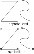 | Example 8 places a symbol at each significant point. EXAMPLE08 0 Symbolization example 08 BK N DR 03 05 13 EXAMPLE08 L0 KUTPY,PAS/OFF.02,BFX.001,SYO, BNX.02(BNX.5,SYX)DNX.01 The definition contains a beginning pattern with the following components: • KTW: changes the symbol ID to TW (a pylon) • PAS/OFF.02 - outputs the unsymbolized line and offsets it by • BFX.001 - inserts a very small blank, necessary to place the centre of the following pylon symbol at, or as near as possible to, the beginning of the line • SYO - places a pylon symbol • BNX.02 - leaves a normalized blank The repeat pattern contains the following: • BNX.5 - inserts a normalized blank which allows for spacing between the pylon symbol and the PASsed line which is to follow • SYX - indicates that a symbol will be placed at the end of the line only The short pattern specifies a normalized dash |
