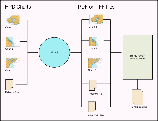 For example, a small-craft chart booklet might be compiled in Atlas by adding database charts along with external files from third-party applications, such as Microsoft Word.