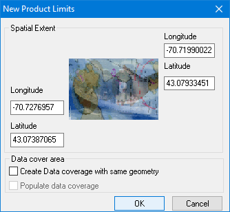 Data cover area | Select the method of populating the product with data. Create data coverage with same geometry: • On: Creates a product with a data cover area that is same as the spatial extent but not populated with data. Populate data coverage becomes available. • Off: Creates a product with a spatial extent and no data cover area (thus not populated with data). Populate data coverage: • On: The product is populated with data from within the spatial extent defined • Off: The product is not populated with data. If both options are on, no additional commands are required as the data coverage area is already selected and the product is populated with data. |