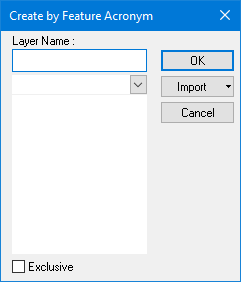 Select the acronym | Select one or more acronyms using one of the following methods: • Type in the box. If any acronyms start with the letters you type, they will be displayed. • Click the down arrow and select from the list. • Click Import and select from the menu: • From Clipboard: The contents of the clipboard are copied to the list. For this to work correctly, the clipboard must contain one or more acronyms, one to a row, in all upper case. • From Selection: The acronyms of all selected features are added to the list. • From Superselection: The acronym of the superselected feature is added to the list. |