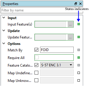 Properties Status Indicators | A status indicator is a small box to the right of each property. The colour of the box means the following: • White: Default value • Grey: A value has been set or the default value has changed. • Red: Mandatory. A value must be set for this field. • Green: Display the property name as an input to the process. Click on the indicator box and select Reset to restore defaults. |