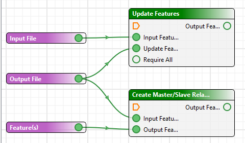 The red triangle with the exclamation point at the right of the title bar indicates that the process is incomplete or that parameters are not fully defined. Red circles indicate where mandatory parameters must be linked. Parameters that are defined are green-filled. Hollow green circles indicate optional parameters. |