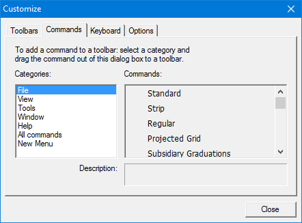 The Categories list contains all the menus. The Command list contains the commands in the selected menu.