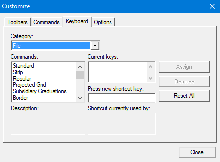 A brief definition of the selected command is shown in the Description field. If there is a default Windows shortcut, it is displayed in the Shortcut currently used by field