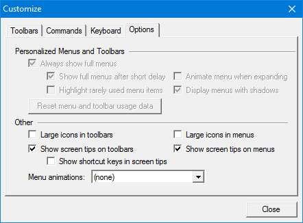Show screen tips on menus | On: Screen tips are displayed when you hover over a menu item. Off: No screen tips are displayed. |