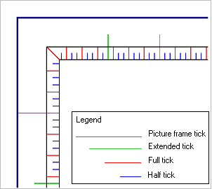 Extended | Extended ticks are longer than full ticks and shorter than picture frame ticks. Extended ticks start on the neatline and stop before reaching the picture frame. If neatline frames surround the neatline, extended ticks should be long enough to extend beyond the outermost neatline frame. Extended ticks must fall short of any labels that lie between the neatline and the picture frame. The spacing of extended ticks is less than the spacing of picture frame ticks and greater than the spacing of full ticks. The spacing of extended ticks must be a whole multiple of the spacing of full ticks. |