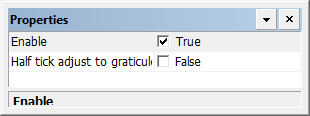 Extend tick to picture frame | Picture frame ticks only. This becomes active only if the value of the Tick Length property is positive. True: Disregard the Tick Length property and extend the tick to meet the picture frame False: Do not extend ticks. Use the Tick Length property. This is useful for projections like Transverse Mercator where the picture frame might bend. |