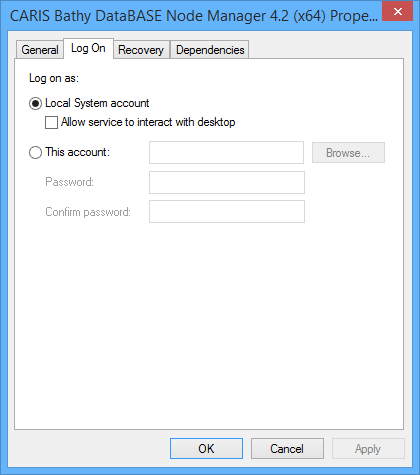 To change the CARIS Bathy DataBASE Node Manager service Log On property: