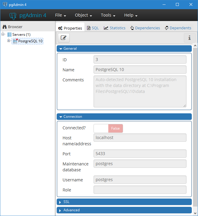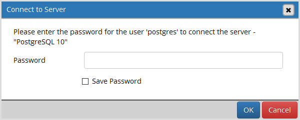 Once inside pgAdmin 4, you will need to connect to the PostgreSQL server using the password you setup for your PostgreSQL user account.