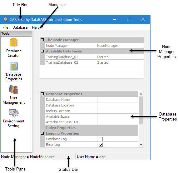In order to access any of the tools or information, you must be connected to a node manager. The CARIS Bathy DataBASE Node Manager <version> service must be started to connect to a node manager.
