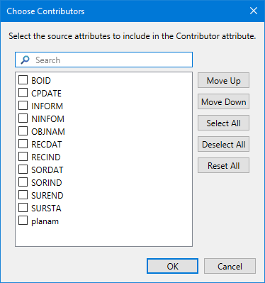 Contributor | The information value that will be used to identify contributor datasets when creating a new cell by combining coverages during a publication. 1. Click the Browse button (...) to launch the Choose Contributors dialog box. 2. Click the check box of each value to be used as an identifier. 3. [Optional] Use the Move Up/Move Down buttons to change the order of the selected objects to control the order in which they will be populated in the metadata for the resulting cell. 4. Click OK. |